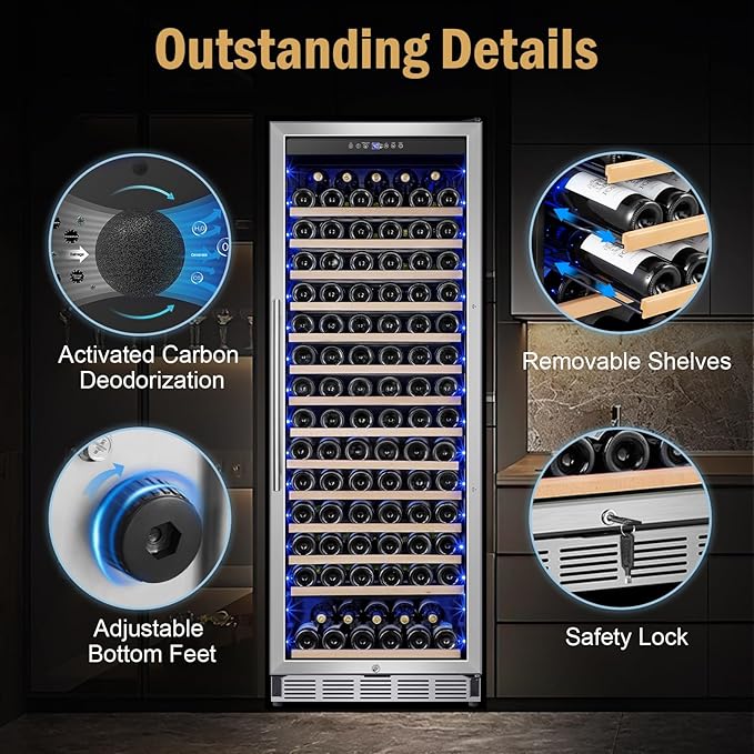 - LARGER CAPACITY & SCRATCH PREVENTION: The upgraded wine refrigerator has a larger capacity top tier and bottom shelf to hold larger bottles of wine while reducing scratched labels. Wine refrigerator freestanding store up to 173 bottles of standard Bordeaux wine (750 ml)