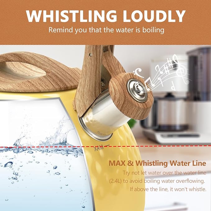 - Automatic Whistle: When the water reaches boiling point, the tea kettle emits a loud whistle to catch your attention, reminding you to turn off the heat. (Tip: Fill up to 80% of capacity to ensure the tea kettle for stovetop whistles effectively)