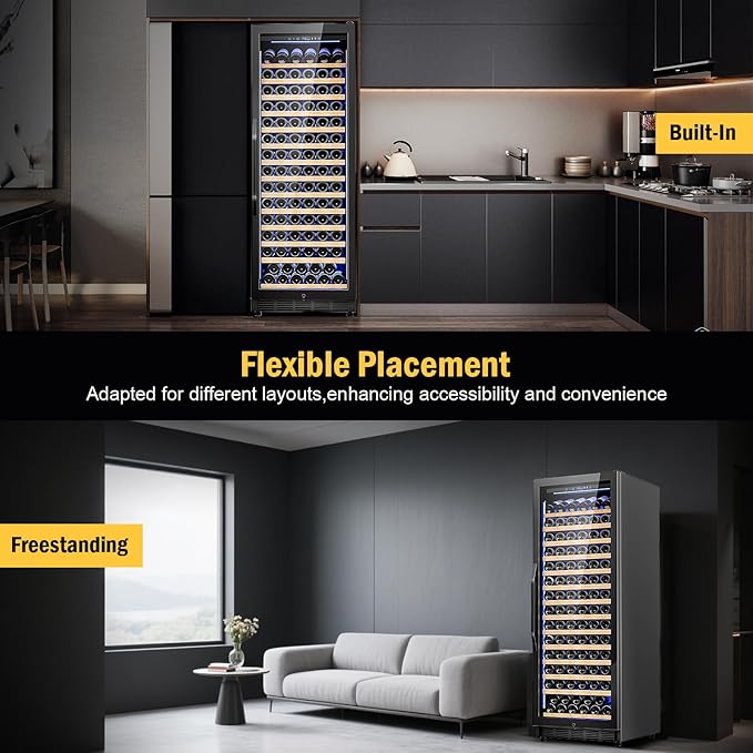 - LARGER CAPACITY & SCRATCH PREVENTION: The upgraded wine refrigerator has a larger capacity top tier and bottom shelf to hold larger bottles of wine while reducing scratched labels. Wine refrigerator freestanding store up to 173 bottles of standard Bordeaux wine (750 ml)
