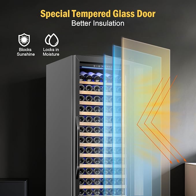 - POWERFUL COOLING SYSTEM: The wine cooler refrigerator is equipped with an advanced compressor that is energy efficient and ultra quiet to cool wine quickly, and two fans that distributes cool air evenly to every corner of the cooler