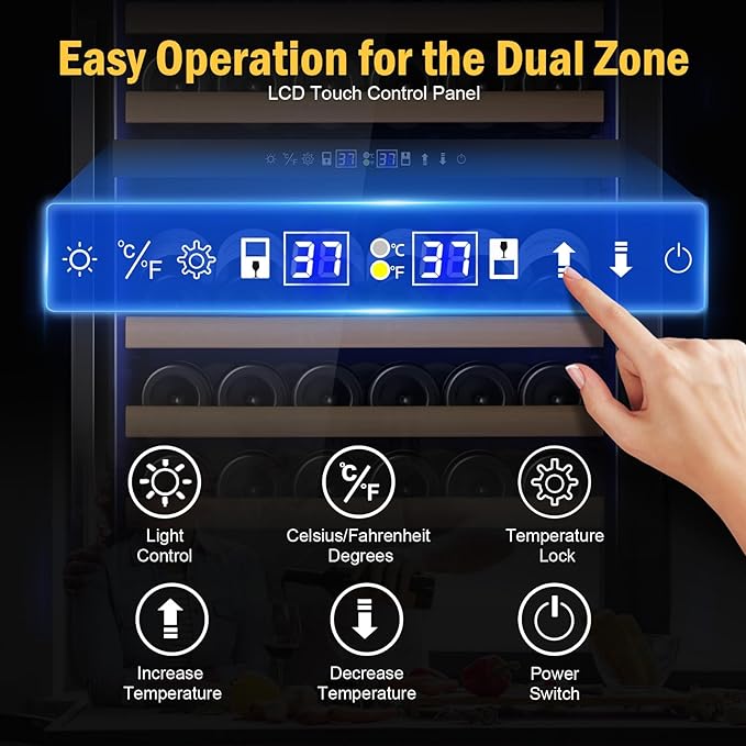 - Precision Cooling with Independent Dual Zones: Professional wine fridge with independent temperature control zones for different wine types. Top zone 40-55° F for dry/white wines, bottom zone 55-65° F for red wines
