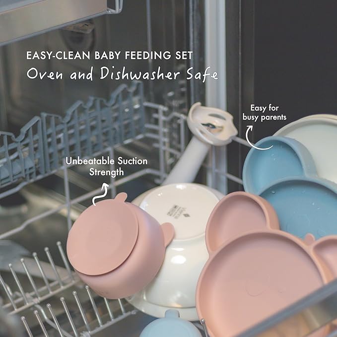 - 🐼 PREMIUM BABY FEEDING ESSENTIALS – SAFE, STRONG & EASY-CLEAN: Dishwasher, microwave and freezer safe, our silicone plates stay firmly in place with powerful suction, keeping food off the floor and on the high-chair tray. Lightweight and shatter-resistant, they’re easy to handle while your little one learns to self-feed. Soft, skin-friendly silicone is gentle on gums, and baby utensils with safety guards help protect tiny mouths for truly worry-free mealtimes.