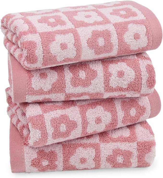 Jacquotha Cotton Hand Towels Pink Checkered Floral - Quick Drying Hand Towel Set of 4, for Women Girls Bathroom Decor, 29” x 13”