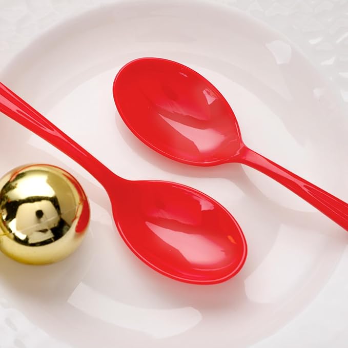 - THE VALUE SET: There are 100pcs plastic spoons that you will never run out of! You can throw away when you're done. If you're willing to hand wash these disposable red spoons, you'll be able to reuse these disposable spoons at your next party