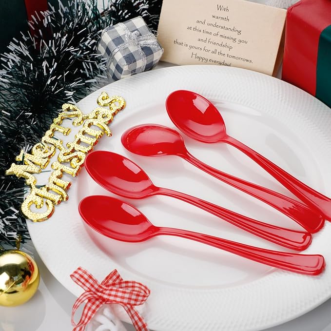 - RED COLOR: WDF red plastic spoons for Christmas will make people feel good. These red spoons disposable are coloured using a special technique that are not only bright but also does not fade. Pairing these red plastic silverware with your carefully prepared food is a visual treat