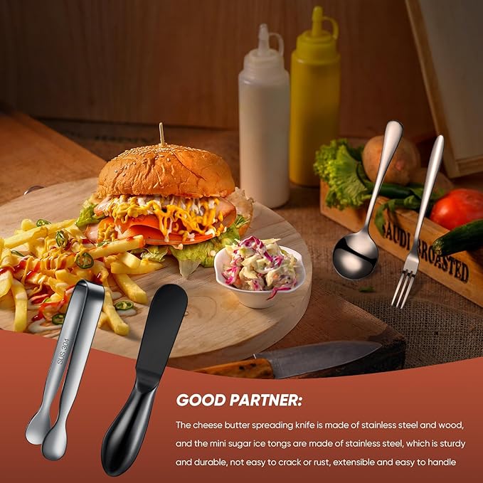 - 14 Pieces cheese butter spreader knives set: includes 4 pieces cheese butter spreader knives with stainless steel handles, 2 pieces mini serving tongs, 4 small spoons and 4 small forks for serving, applied in butter, cheese, butter, jelly, butter and pastry making; It is enough to satisfy your daily use and can be given to relatives and friends as gifts, which can bring a lot of convenience