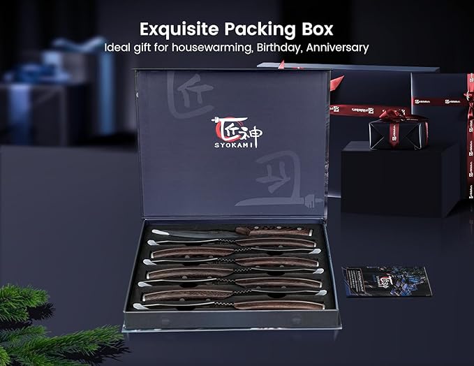 - SYOKAMI steak knives are forged to HRC56+ from high quality and safe material Japanese high carbon stainless steel, hand-sharpened to a 15-degree blade angle on each side, offering excellent and durable sharpness. Non-serrated straight-edge blade allows a smooth slice on steaks and will not tear the meat fibers to lock the original flavor and nutrition of the steak