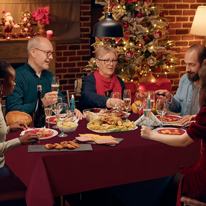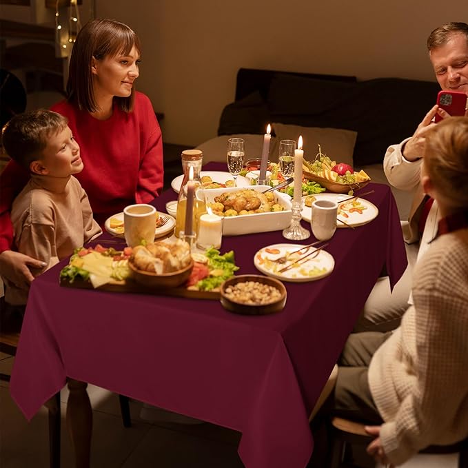 - MEASUREMENTS: This burgundy table cloth is 60 inch wide and 102 inch long, perfect for standard 6ft table, providing 15 inch drop.