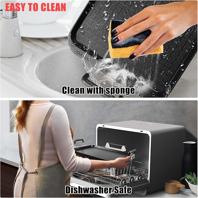 - Non-stick & Non-Rust Coating: The surface of our griddle has a convenient non-stick coating, making cooking and cleaning easier. Your food won’t stick, allowing you to create Insta-worthy meals every time. Your food will cook up crisp outside, and tender inside. You’ll make perfect pancakes, grilled cheese sandwiches, etc. Food slides right off and onto your plate and clean-up is quick and easy. No more having to soak your pan or struggle to do the dishes
