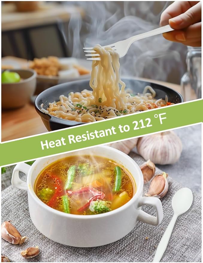 - 【LET’S GO GREEN】Use disposable utensils without harming the environment. our disposable cutlery is made of natural corn starch. Compostable spoons and compostable forks are great alternatives to plastic spoons and forks