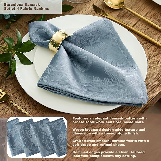- Barcelona Damask fabric tablecloths feature a traditional allover medium format woven scroll and acanthus leaf damask design with a subtle visual texture.