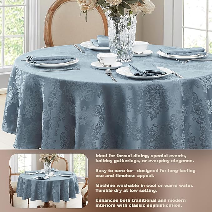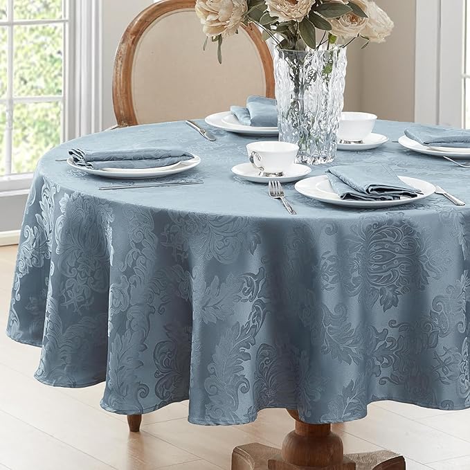 - Newbridge Barcelona Damask Fabric Tablecloth, 90 Inch Round, No Iron, Soil Resistant, Blue Indoor Dining, Party and Holiday Table Cover