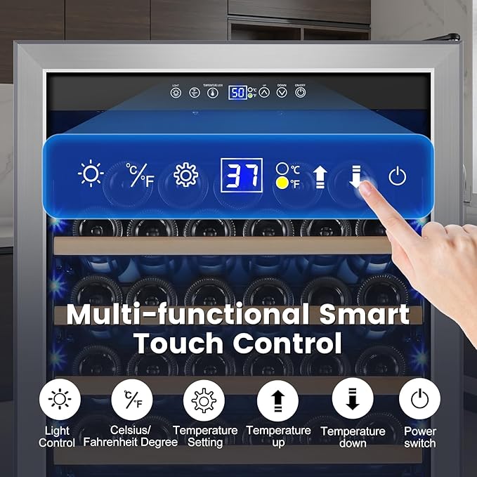 - Blue Protective Light & Smart Control: The wine cooler features a blue LED light that protects the tannins in your wine, preserving its perfect taste while creating a romantic atmosphere. The smart LED control panel makes operation convenient and intuitive.