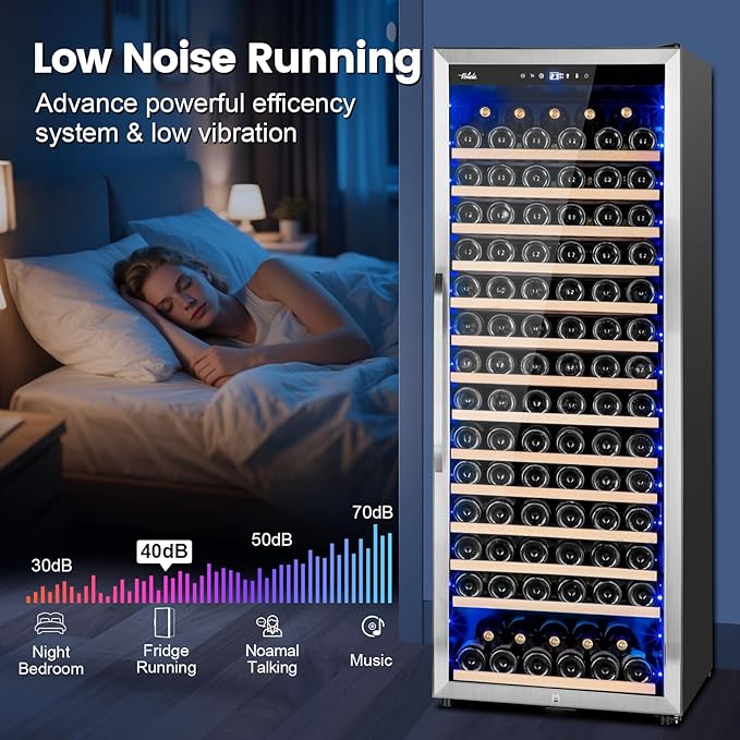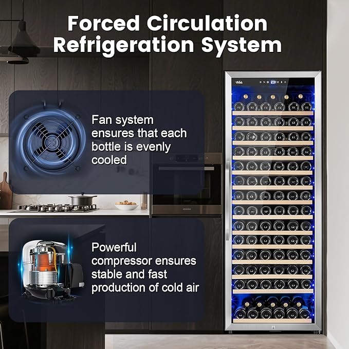 - Ultra-Silent & Energy-Saving: Equipped with energy-efficient and highly soundproof compressors, the wine cellar operates with whisper-quiet performance and minimal vibration. The sturdy door seal ensures cold air retention, enhancing refrigeration efficiency.