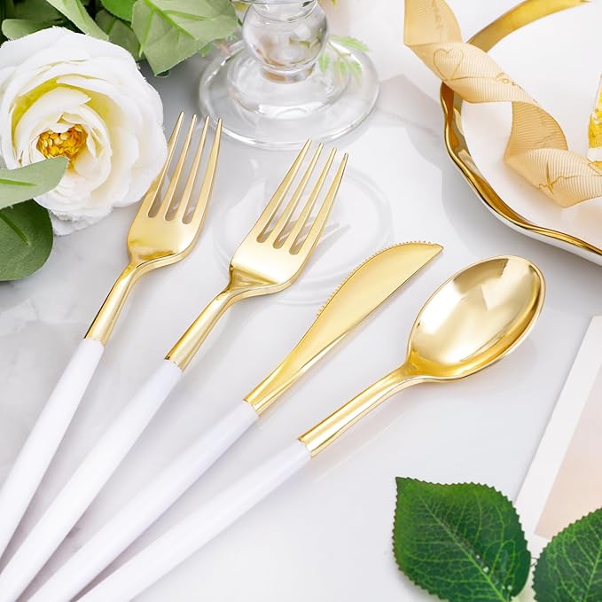 - Premium Quality: Our gold plastic silverware are made from durable hard plastic. The sturdy construction allows for worry-free handling and guarantees a sleek and elegant dining experience. All white and gold plastic silverware are made of 100% food grade, non-toxic, BPA-free plastic.