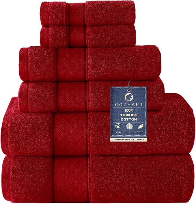 COZYART Red Bath Towel Set 6 Piece, Luxury 100% Turkish Cotton 650GSM Hotel Quality, Soft, Absorbent,Towel Sets for Bathroom | 2 Bath Towels 2 Hand Towels 2 Washcloths