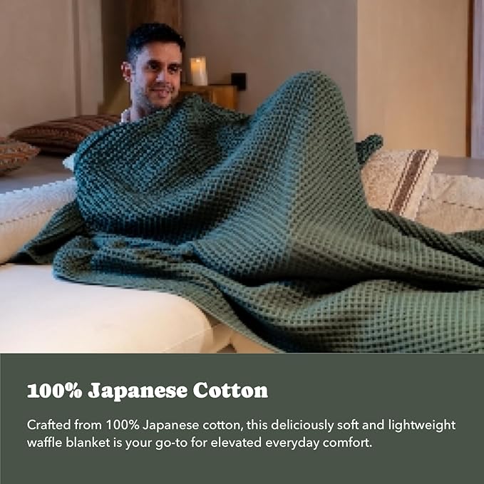 Luxury Organic Japanese Cotton Waffle Towelket Throw Blanket Bedspread for All Sleepers | Soft, Breathable and Thermoregulating (Forest Green, 67''x91'')
