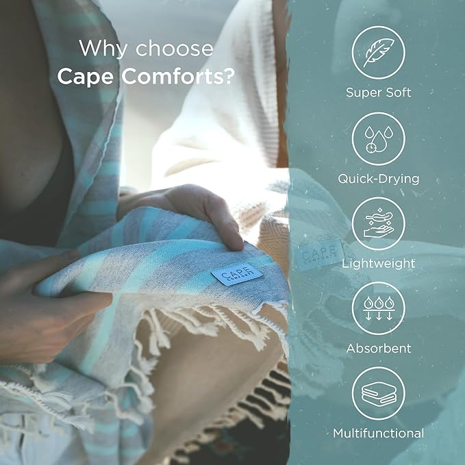 - Travel-Friendly: Compact and lightweight, Cape Comforts beach towels are easy to pack and carry. This makes them an ideal travel companion.