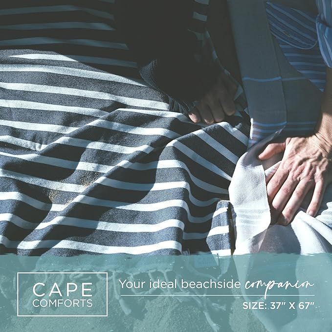 - Ideal Beachside Companion: The Cape Comforts Stripe Beach towel is your ultimate beachside essential. Perfect for sunbathing, picnicking, or traveling, this towel is specially designed to cater to fit every lifestyle. 37”x 67”. Two tone stripes: Navy / Natural.