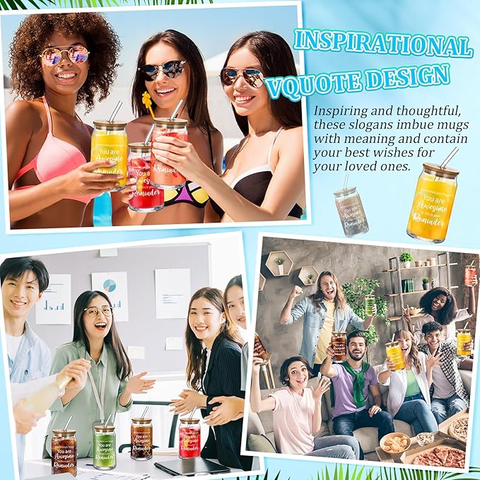 - Appreciation Gifts Set: you will receive 12 set appreciation gift boxes set, including 12 pcs 16 oz glass cups with clear texts printed on the surface (with 12 bamboo lids, 12 glass straws, and 12 glass straw brushes), and 12 pcs 7.48 inch glass cup gift boxes (with 12 ribbons); Sufficient quantity makes it convenient for you to use anytime and anywhere, and it is a very practical and exquisite combination set