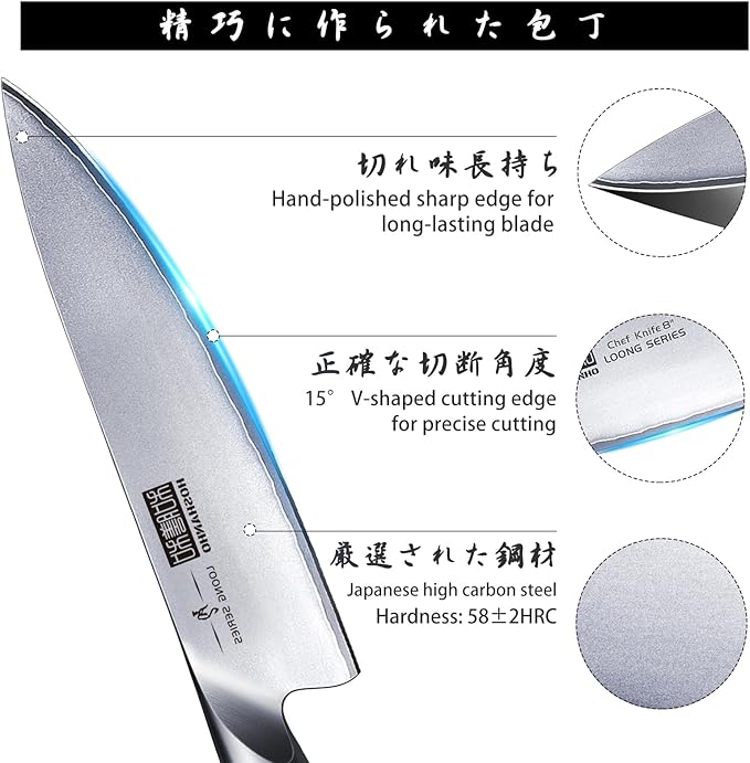 - 【Forged Japanese Steel】Made of high-quality Japanese 10Cr15CoMoV stainless steel, it has strong resistance to stain and rust; After high-temperature forging, the hardness reaches up to 58 HRC, which ensures that the kitchen knife is durable and remains sharp even in daily use