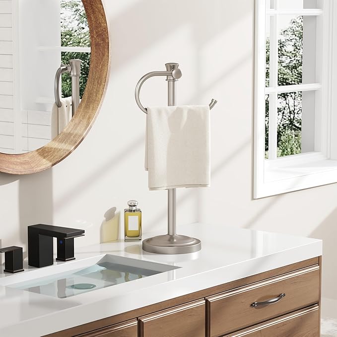 - Space Saving:The bathroom hand towel satnd can be moved freely to save space. This brushed nickel towel rack is designed for free standing and can be placed anywhere in the house.