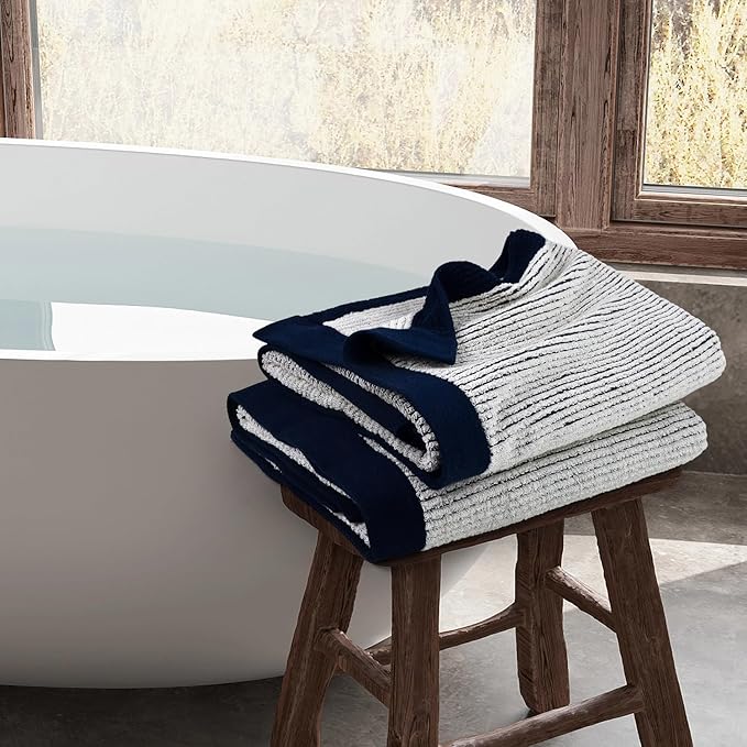 Cleanbear Fluffy Bath Towels for Bathroom, Shower Towel Set of 2, Jacquard Weaved Soft Cotton Cloths Navy-Blue, 54 by 28 Inches