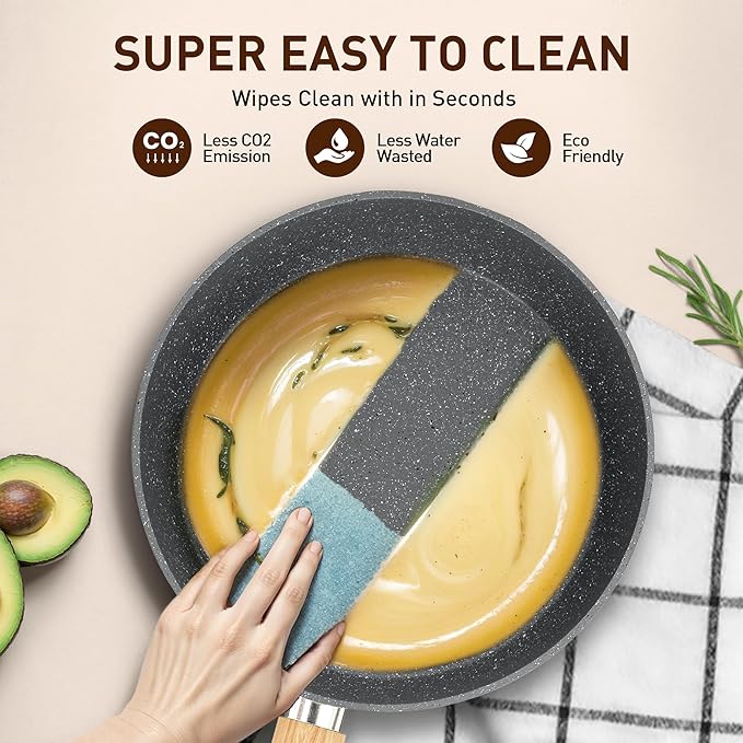 - 𝐄𝐚𝐬𝐲 𝐭𝐨 𝐂𝐥𝐞𝐚𝐧: Say goodbye to scrubbing and soaking. Our cookware features a smooth, easy-to-clean surface, ensuring that tidying up is as simple as enjoying your delicious creations. Easy to clean pots and pans set