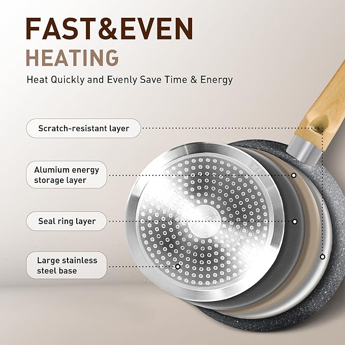 - 𝐄𝐯𝐞𝐧 𝐇𝐞𝐚𝐭𝐢𝐧𝐠 𝐓𝐞𝐜𝐡𝐧𝐨𝐥𝐨𝐠𝐲: Our induction pots and pans does not contain PFOS,PFOA, The set's even heating tehnology guarantees uniformly cooked meals. No more hot spots or unevenly cooked food – every dish is a masterpiece. Nonstick pot set for precise cooking