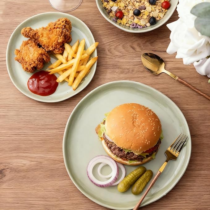 - GOOD SHAPE AND MULTI-PURPOSE:the flat dinner plates set creates a Rustic and minimalist table setting.The shape is great as it makes. they are easier to handle and hold and they stack really well without taking up much space,stack and nestle nicely in your cupboard or shelves.Our Dinnerware set is microwave,dishwasher and freezer safe,Perfect for every day use, indoors or out; ideal for any kitchen let your food look even more delicious, and make you happy every day.
