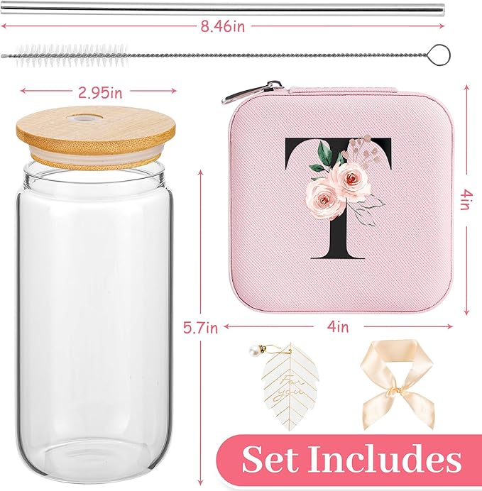 - 🌸Initial jewelry box and Glass with Bamboo Lid and Straw Set: personalized initial printed jewelry box and a 16 oz. glass with bamboo lid and straw, the jewelry box is made of high quality PU leather with eco-friendly nubuck lining, soft and luxurious, won't scratch your jewelry. jewelry box size: 3.93*3.93*1.8 inches, glass size: 2.95*5.7 inches, straw size: 2.36*8.46 inches
