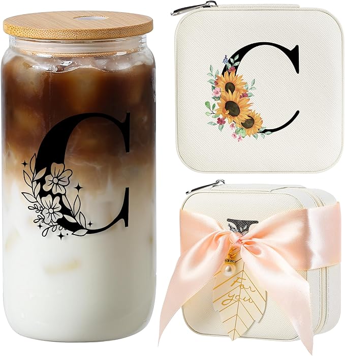 - 🎀UNIQUE DESIGN: The portable jewelry box is printed with the initials of the sunflower pattern, which represents sunshine and positive warmth, and comes with a ribbon, a pearl, small pins, and a card; tie the ribbon, write her name on the leaf shaped card, and then use the pins on the ribbon to pin the card and pearl together. The glass with a bamboo lid is also initialed, and the glass and jewelry box are sure to make the perfect one-of-a-kind gift!