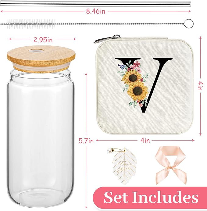 - 🎀UNIQUE DESIGN: The portable jewelry box is printed with the initials of the sunflower pattern, which represents sunshine and positive warmth, and comes with a ribbon, a pearl, small pins, and a card; tie the ribbon, write her name on the leaf shaped card, and then use the pins on the ribbon to pin the card and pearl together. The glass with a bamboo lid is also initialed, and the glass and jewelry box are sure to make the perfect one-of-a-kind gift!