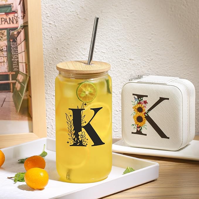 - 🎀UNIQUE DESIGN: The portable jewelry box is printed with the initials of the sunflower pattern, which represents sunshine and positive warmth, and comes with a ribbon, a pearl, small pins, and a card; tie the ribbon, write her name on the leaf shaped card, and then use the pins on the ribbon to pin the card and pearl together. The glass with a bamboo lid is also initialed, and the glass and jewelry box are sure to make the perfect one-of-a-kind gift!