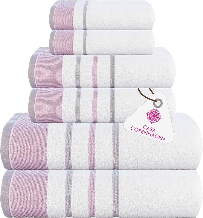 CASA COPENHAGEN White Bay, 6 Pieces Towel Set- White with Lavender and Grey Border, 600 GSM, 2Bath, 2Hands, 2Washcloths Egyptian Cotton Towel for Hotel Spa Kitchen Bathroom Kitchen & Shower