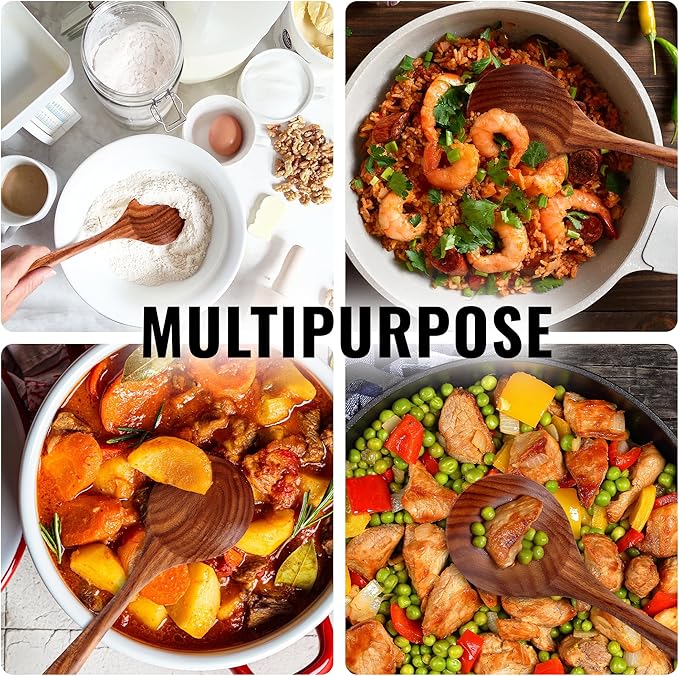 - SCRATCH-FREE DESIGN: Designed to protect non-stick, ceramic, and cast iron cookware, this premium teak wood spoon is lightweight, sturdy, and gentle on surfaces. Perfect for everyday cooking without worrying about scratches or damage.