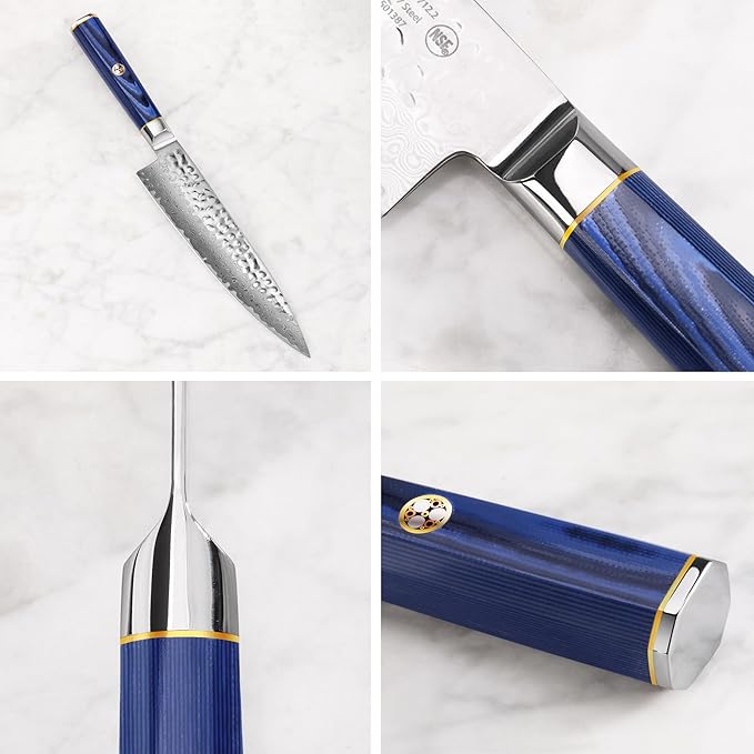 - Hand-sharpened by highly skilled artisans, the full-tang X-7 Damascus steel blades ripple with a beautifully hammered surface that encourages sliced foods to slide right off.