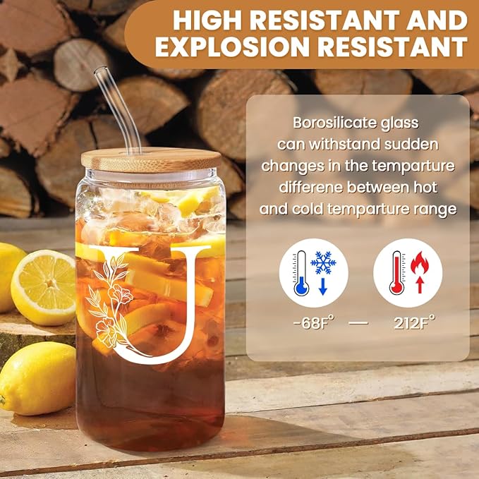 SANDJEST Monogrammed Gifts for Women - Monogram U Initial Glass Cup 16 Oz Can Coffee Cups with Lid and Straw - Monogram Initials Gifts for Womens on Birthday