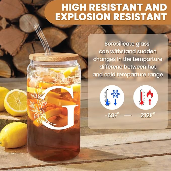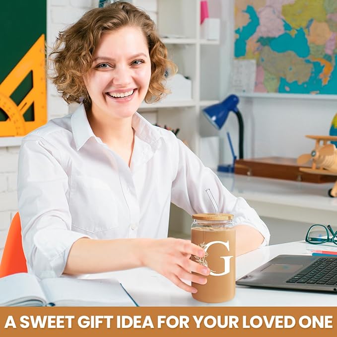 SANDJEST Monogrammed Gifts for Women - Monogram G Initial Glass Cup 16 Oz Can Coffee Cups with Lid and Straw - Monogram Initials Gifts for Womens on Birthday