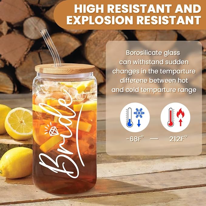 SANDJEST Bride Glass Coffee Cup 16 Oz with Bamboo Lid and Straw - Bridal Shower Gift - Engagement Gifts for Women - Bride Gifts