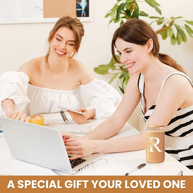 SANDJEST Monogrammed Gifts for Women - Monogram R Initial Glass Cup 16 Oz Can Coffee Cups with Lid and Straw - Monogram Initials Gifts for Womens on Birthday