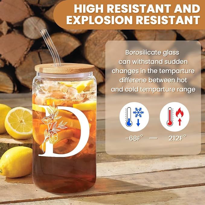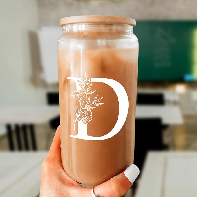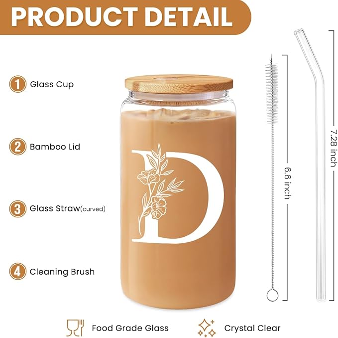 SANDJEST Monogrammed Gifts for Women - Monogram D Initial Glass Cup 16 Oz Can Coffee Cups with Lid and Straw - Monogram Initials Gifts for Womens on Birthday