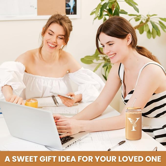 SANDJEST Monogrammed Gifts for Women - Monogram Y Initial Glass Cup 16 Oz Can Coffee Cups with Lid and Straw - Monogram Initials Gifts for Womens on Birthday