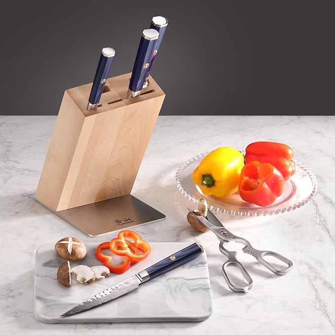 - This knife set comes with an HUA maple wood block or a blue block, giving you easy access to your favorite knives and keeping them safe when stored.