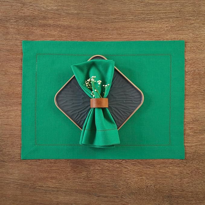Solino Home Linen Cloth Placemats Set of 4-100% Pure Linen Hemstitch Emerald Green Placemats 14 x 19 Inch - Classic Hemstitch Table Place Mats for New Year