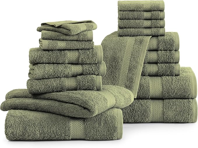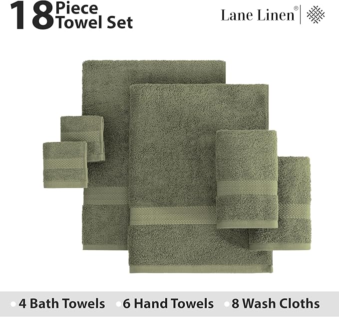 LANE LINEN 100% Cotton Luxury Towel Set for Bathroom - 18 Pieces, Ring Spun - Plush, Soft & Highly Absorbent - 4 Shower Towels, 8 Washcloths, 6 Hand Towels - Complete Bathroom Towel Set - Oil Green
