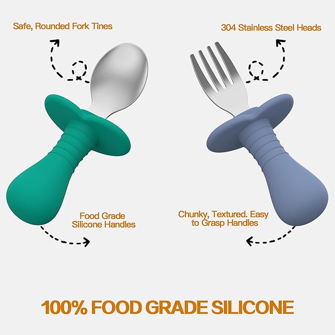- Toddler Utensil Food Grade Material - Forks and Spoons 100% Food Grade Silicone Material and food grade 304 stainless steel, PPA & BPA & PVC Free. Baby can Assured use and eat happily, they’re dishwasher safe, or you can sterilize these utensils for up to 1 minutes in boiling water as well. All parts can be steam or water boiling, microwave & dishwasher safe (time less than 1 minute)