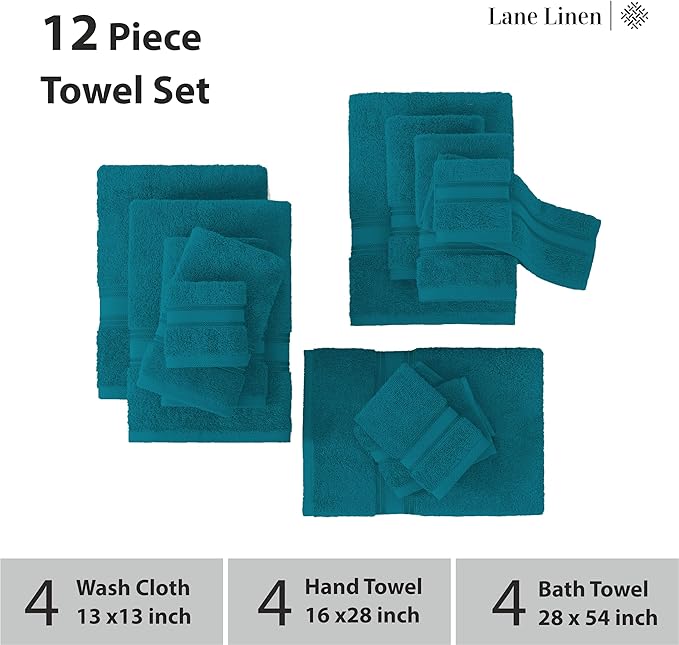 LANE LINEN Luxury Bath Towels Set - 12 Piece, 100% Cotton, Zero Twist, Super Soft & Absorbent, 4 Bath Towels, 4 Hand Towels, 4 Washcloths - Sea Port