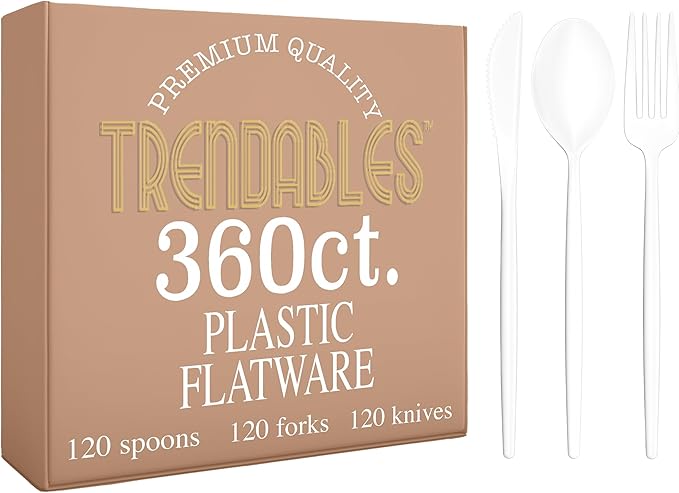 Trendables White Plastic Silverware Set White Silverware Disposable Forks and Spoons Disposable 360 Pack Plastic Utensils Set Includes 3 x 120 each Knives & Spoons & Forks For Parties and Events