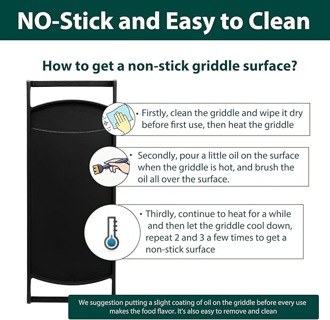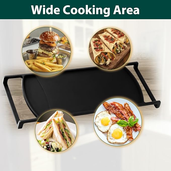 - Non-stick and Easy to Clean: Nonstick helps with cleaning your Frigidaire flat top griddle for stovetop should be a relatively simple process. We suggestion seasoning the gas stove griddle plate for the first time you use it to get a smooth and non-stick surface and the seasoned iron griddle will enhance the flavour of the food